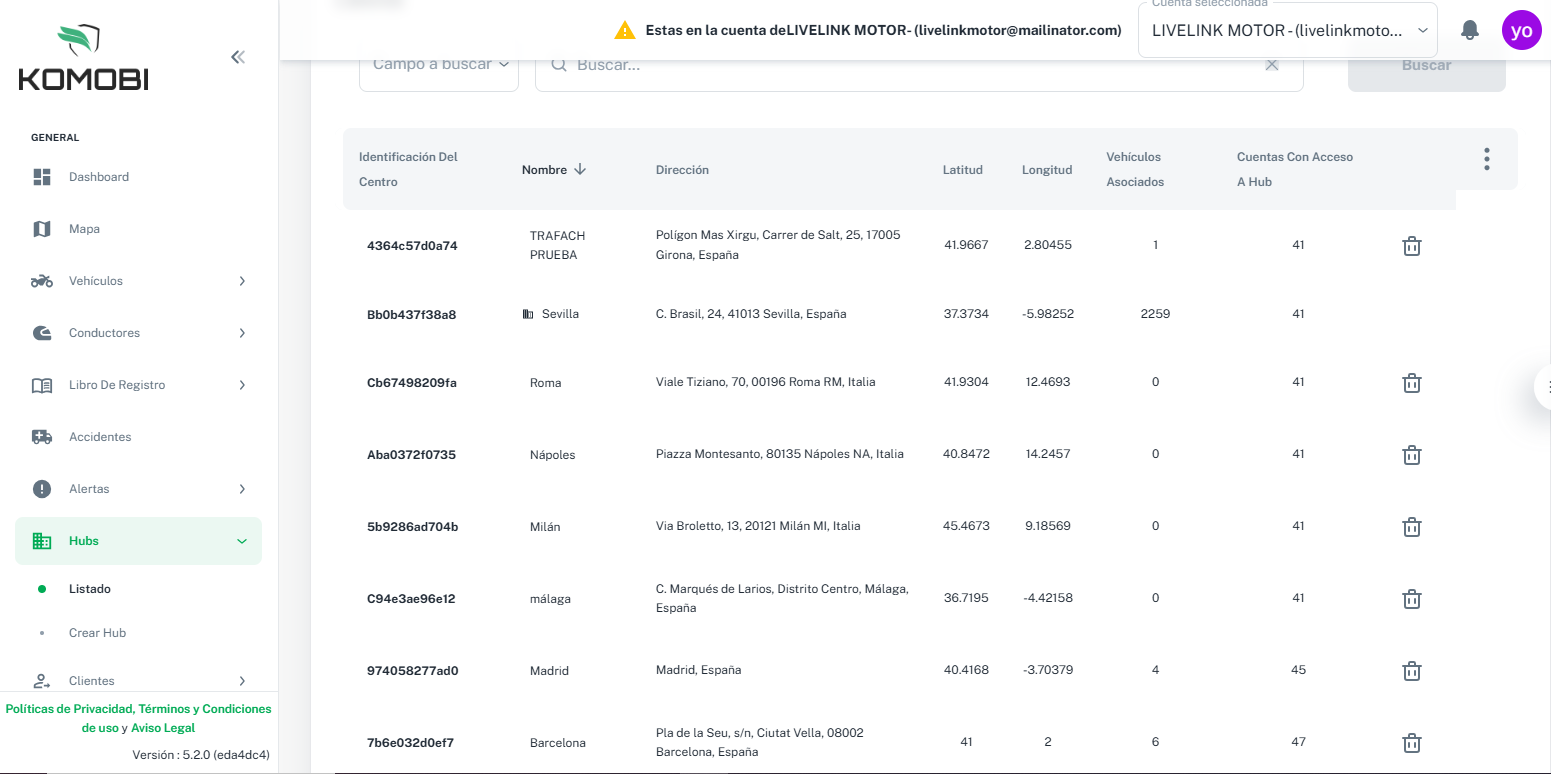 - Vehículos asociados: Listado de los vehículos asignados a ese Hub.