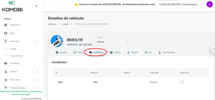 Como ya hemos visto, tendremos el registro de todos los accidentes detectados de nuestra flota, dentro de cada vehículo en el apartado “accidentes”: