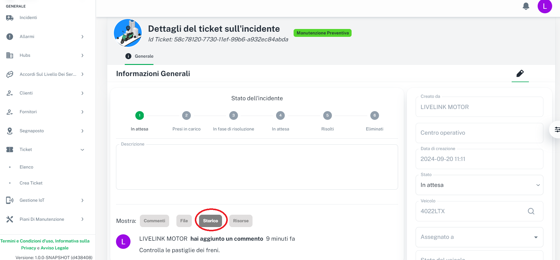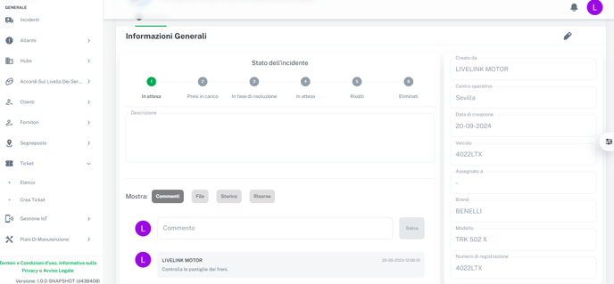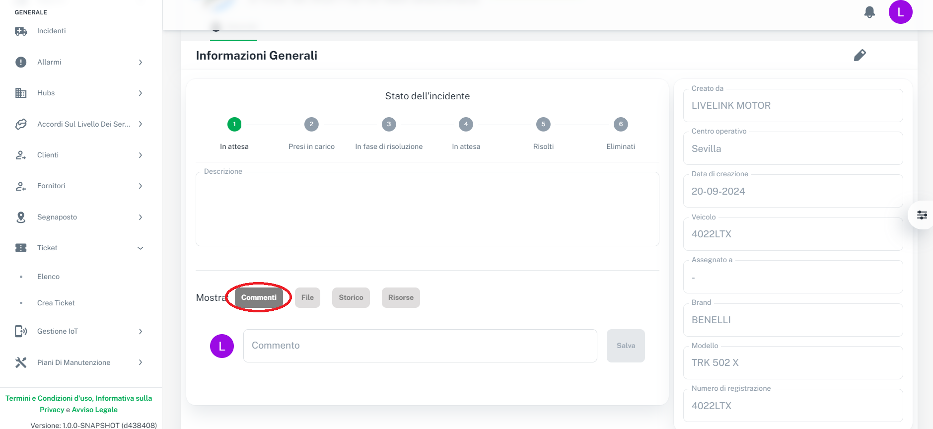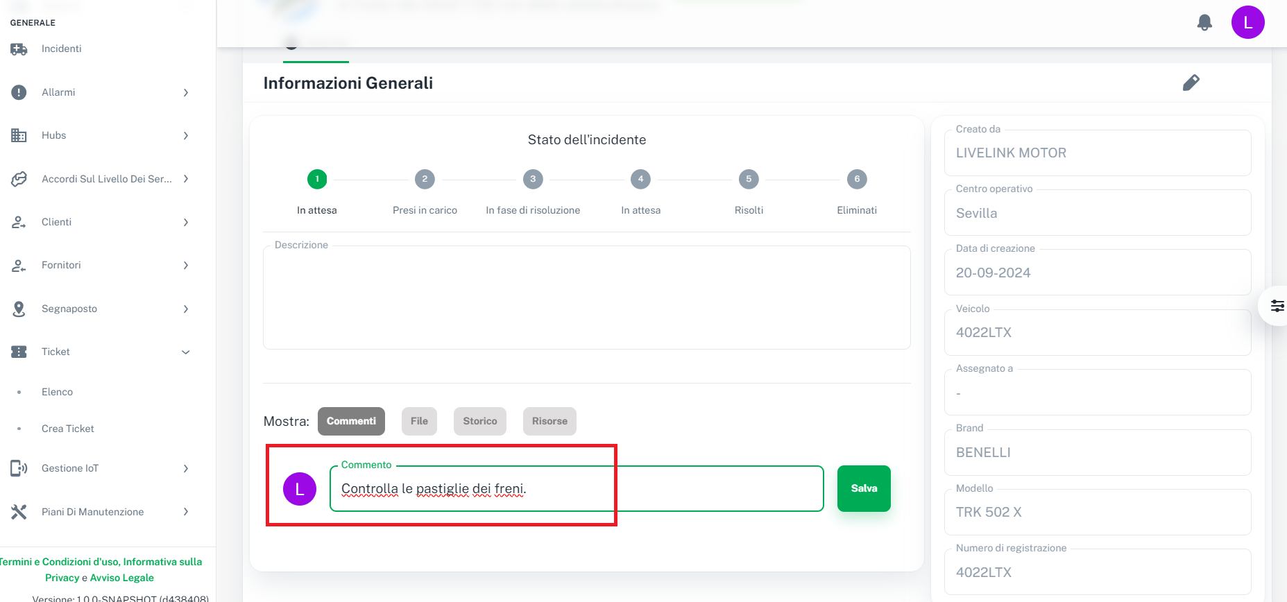 Nell'immagine seguente vediamo un ticket creato da LIVELINK MOTOR assegnato all'account Livelink Motor child. Tra le opzioni disponibili, vediamo che la prima è "commento":