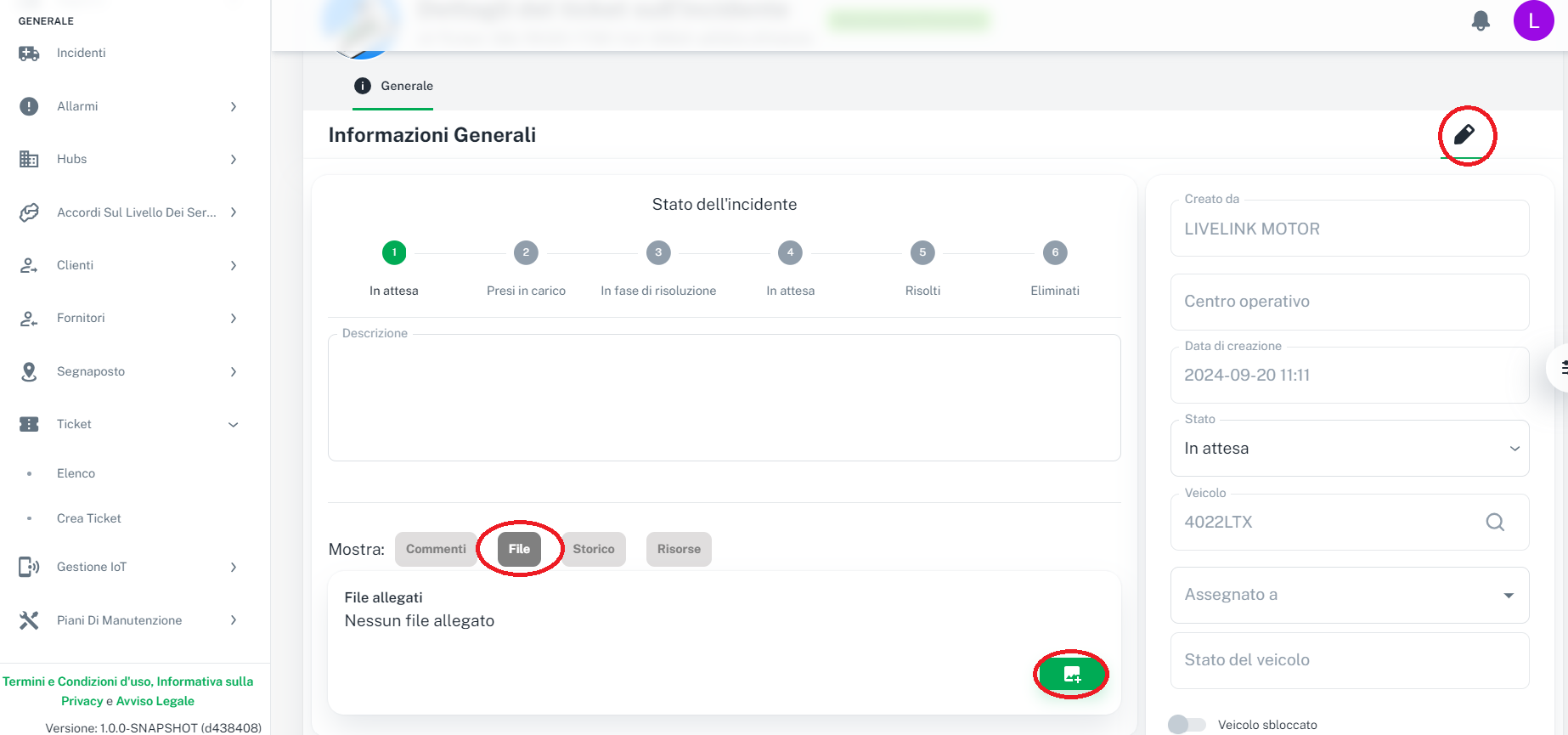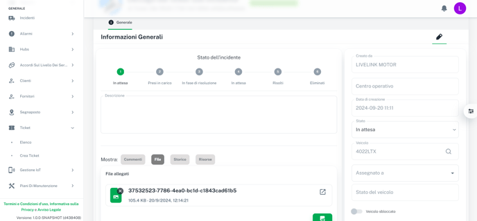 Vediamo come nella sezione "file" l'account LIVELINK MOTOR ha caricato un file che è la foto di uno specchietto retrovisore con il vetro rotto. Parallelamente, l'account Livelink Motor Child, a cui è assegnato il ticket, riceverà tale foto.