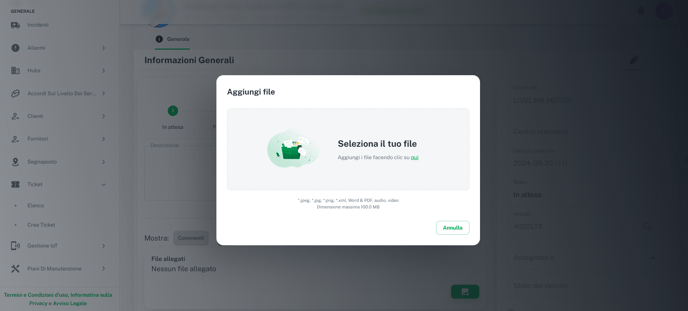 Cliccando su "qui" accederemo ai nostri file per poterli caricare sul ticket. In questo caso, se carichiamo la foto dello specchietto retrovisore di una delle nostre moto, trovandolo danneggiato, potremo condividerla con l'account a cui è assegnato il ticket: