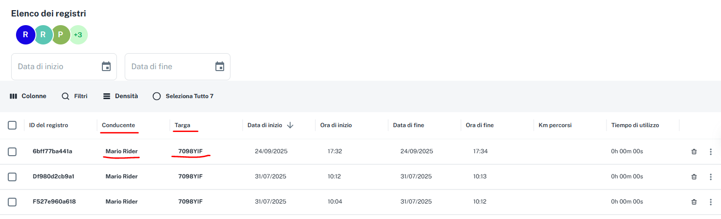 se devi effettuare una verifica su una giornata, parti sempre dall’ID del registro e confronta Ore registrate con Tempo di utilizzo (percorsi) e Numero di percorsi.