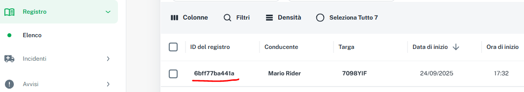 Questo ID viene generato automaticamente quando il conducente registra un’entrata (check-in) e un’uscita (check-out) con un veicolo specifico.