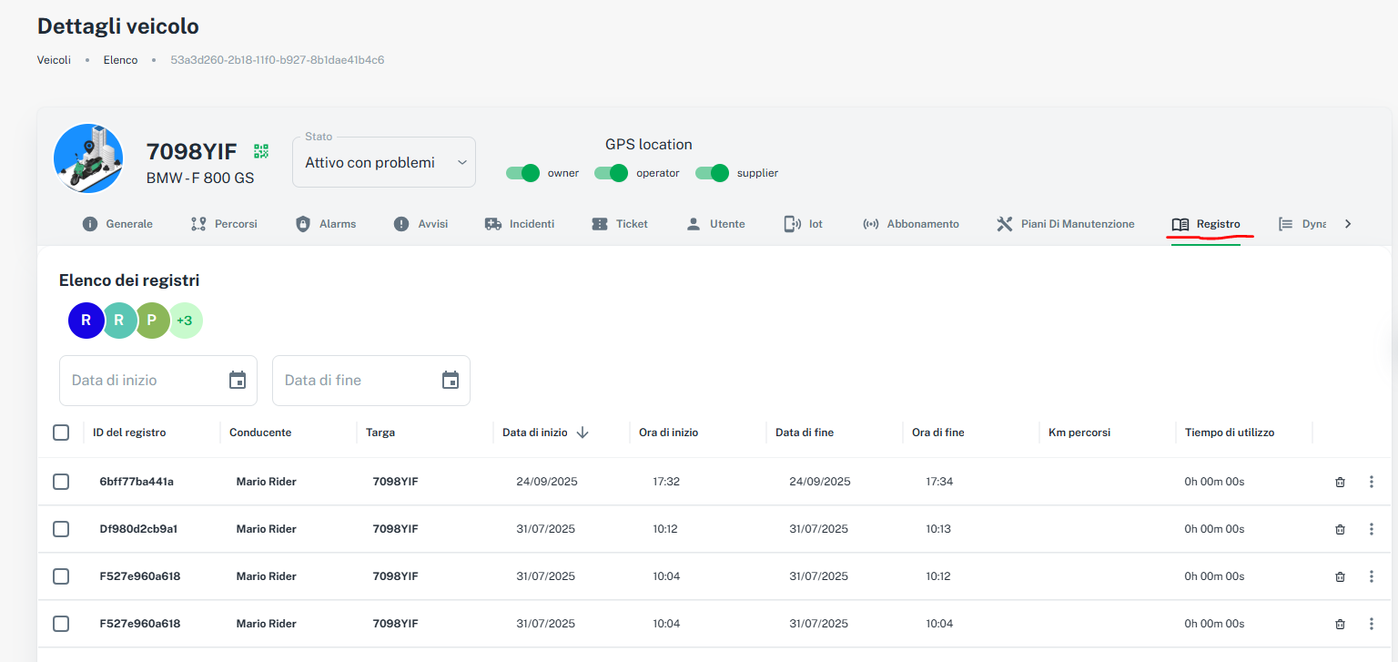 Targa: cliccando sulla targa, accedi al profilo del veicolo.