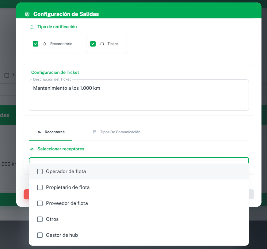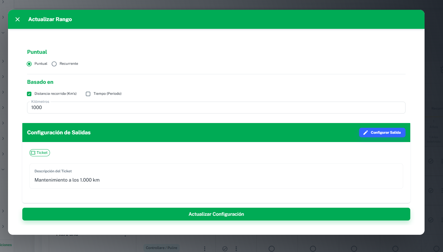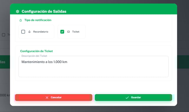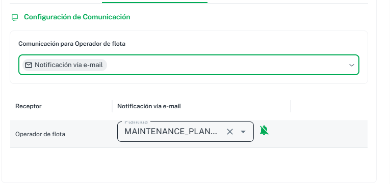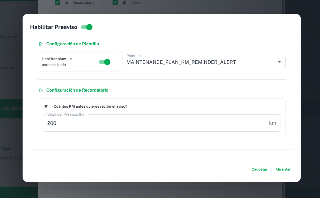 Haciendo clic en la campana que vemos a la derecha de la plantilla, podemos habilitar el preaviso, si queremos que los receptores reciban un recordatorio antes de que se cumplan los Km o el Tiempo establecidos en el Rango.