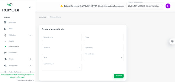 Ya dentro de “Crear nuevo vehículo” tendremos la siguiente pantalla:
