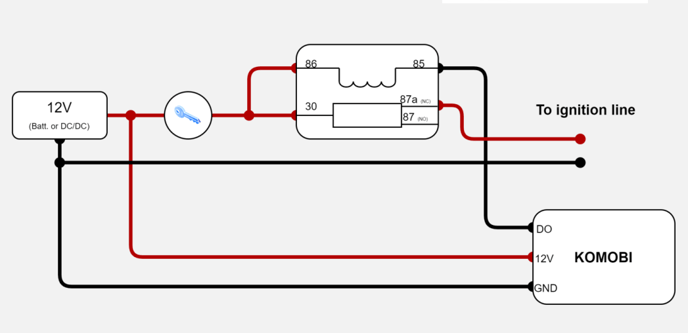 Se instala un relé en la línea de arranque que se activa con la llave del vehículo. Este relé corta la corriente al sistema de arranque cuando se activa desde la plataforma.