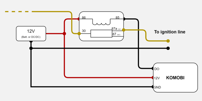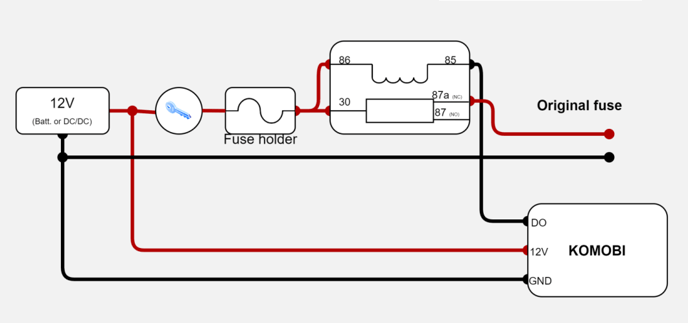 En lugar de cortar cables, se reemplaza un fusible relacionado con el arranque del vehículo por un módulo relé + portafusibles de KOMOBI. El dispositivo puede cortar o permitir el paso de corriente a través del fusible.