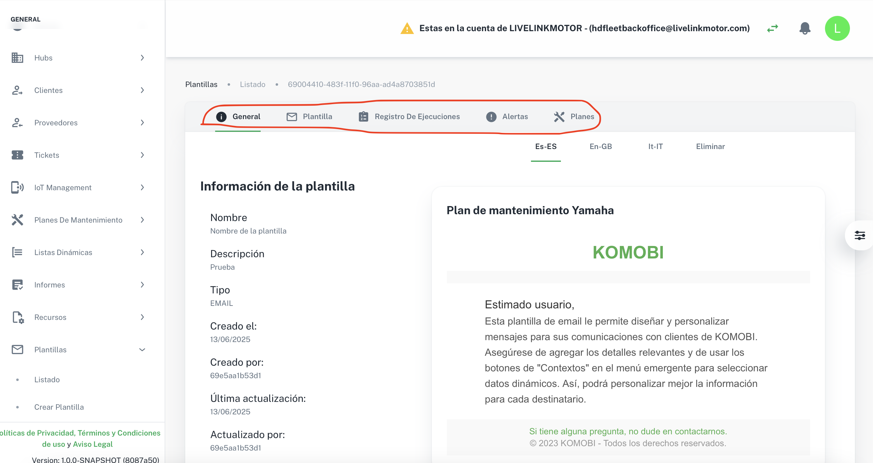 Aquí podemos ver todas nuestras plantillas. Si seleccionamos una, podemos ver la información general de la plantilla, editar la plantilla, ver la actividad reciente, las alertas asociadas a la plantilla y los planes de mantenimiento asociados.