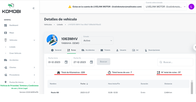 Como ya hemos visto, dentro del listado de vehículos podemos ver la información de cada vehículo, dentro del filtro de fecha podremos conocer: