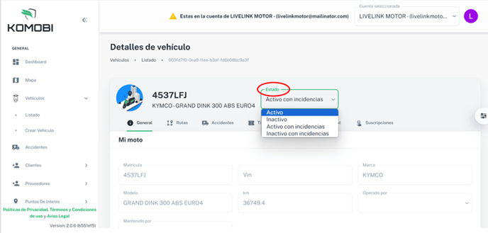 Al clicar en el estado tendremos un desplegable para seleccionar el tipo de estado al que queremos llevar el vehículo: