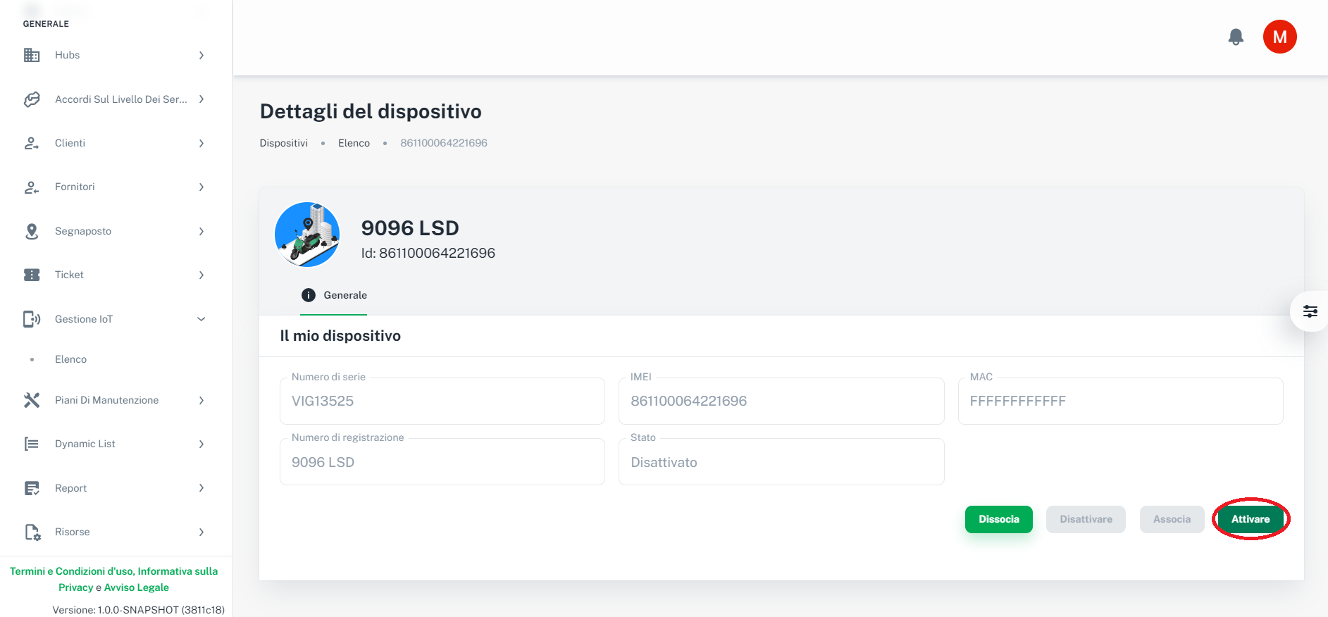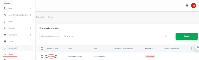 Per poter attivare i dispositivi, questi dovranno essere installati. Una volta installati, potremo accedere alla sezione 'Gestione IoT' per procedere alla loro attivazione. Espandendo questo campo nel menu, vedremo l'elenco dei dispositivi associati all'account; dovremo semplicemente cliccare sul numero di serie del dispositivo che desideriamo attivare, come mostrato in questo esempio: