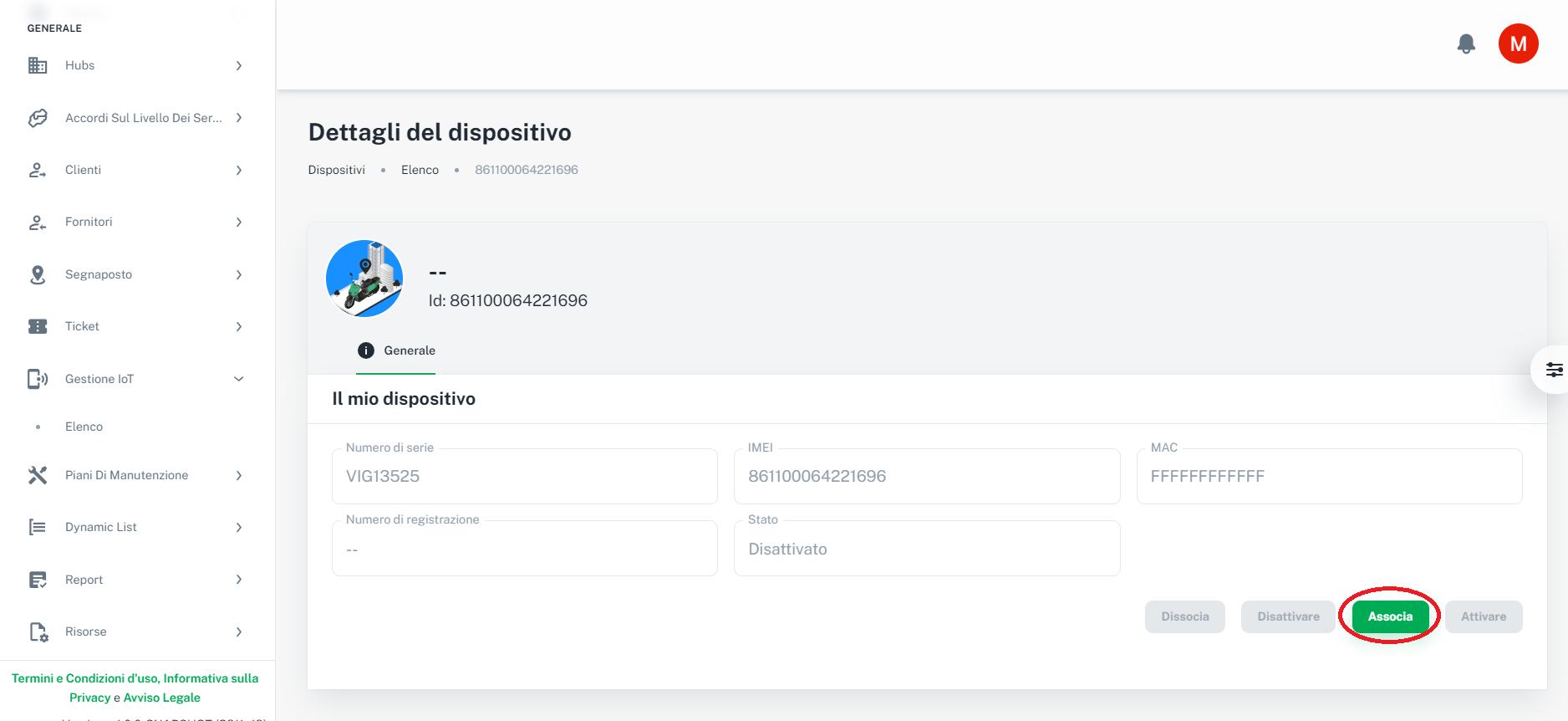Osserviamo che il dispositivo non è associato a nessun veicolo, clicchiamo su 'associa' per selezionare il veicolo precedentemente creato che andremo ad associare.
