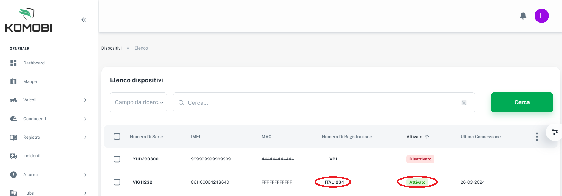 Una volta associato il veicolo, possiamo vedere che lo stato è 'disattivato'; per attivarlo, dovremo semplicemente cliccare su 'Attivare' nel riquadro verde nell'angolo in basso a destra.