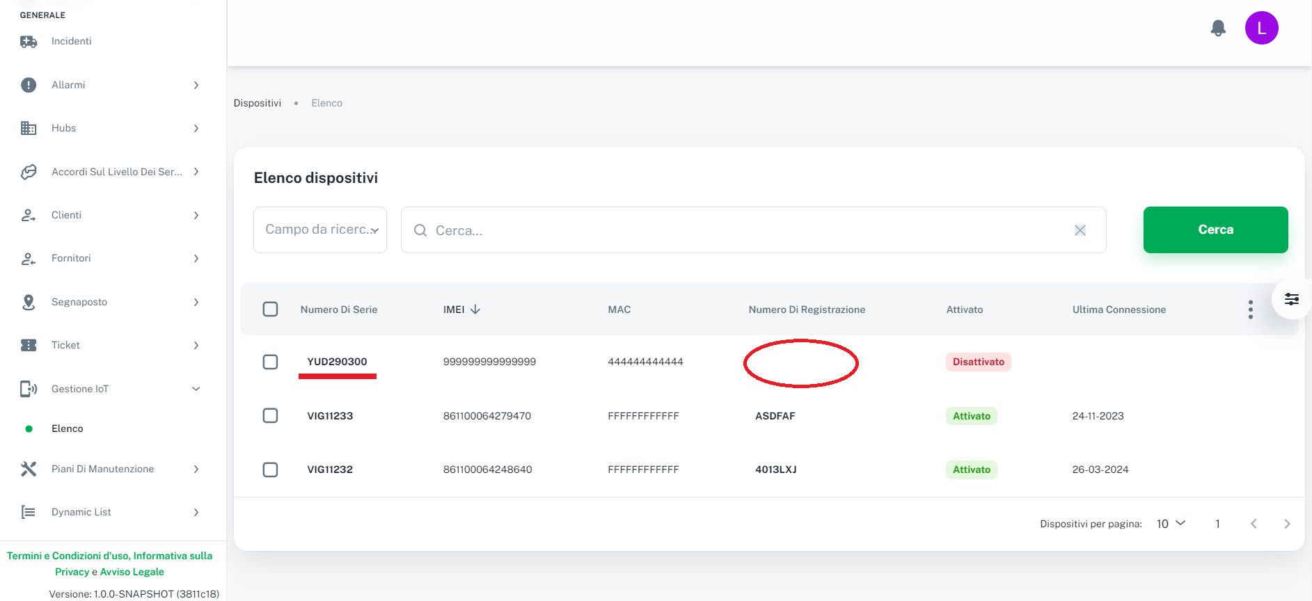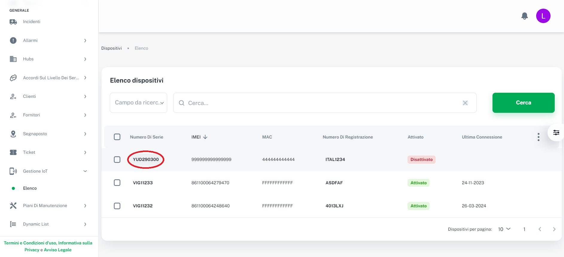 Verifichiamo nell'elenco dove appare il dispositivo senza veicolo collegato.