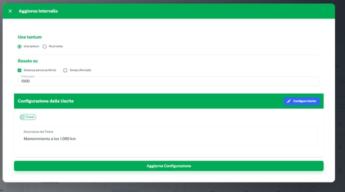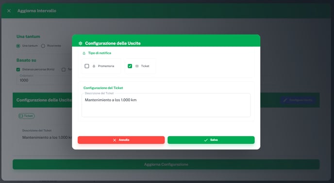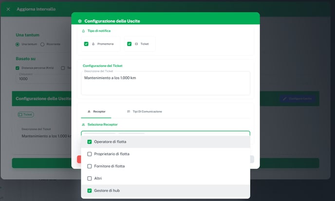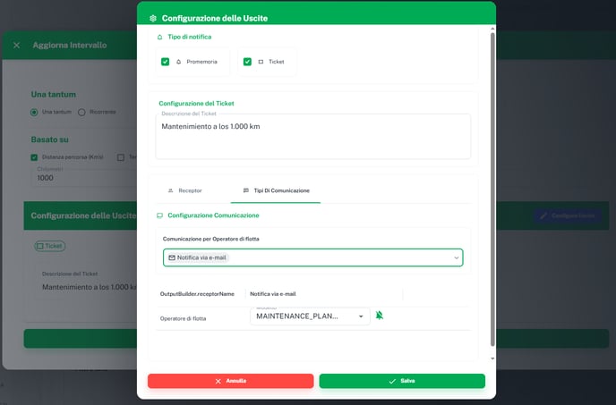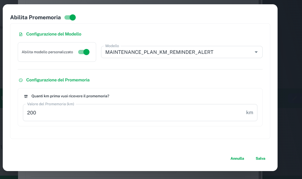 Cliccando sulla campanella a destra del modello, possiamo abilitare il preavviso, per far sì che i destinatari ricevano un promemoria prima del raggiungimento dei km o del tempo stabilito nel range.