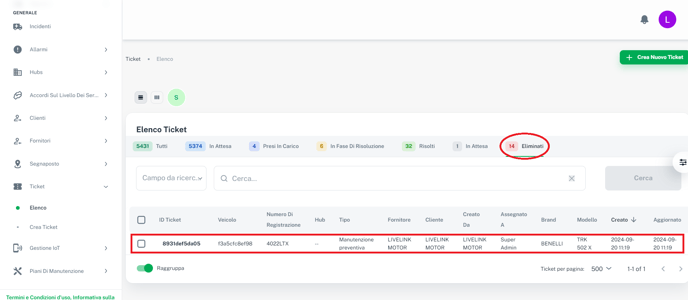 Se torniamo all'elenco dei ticket nel menu, vedremo quel ticket nello stato "eliminati".
